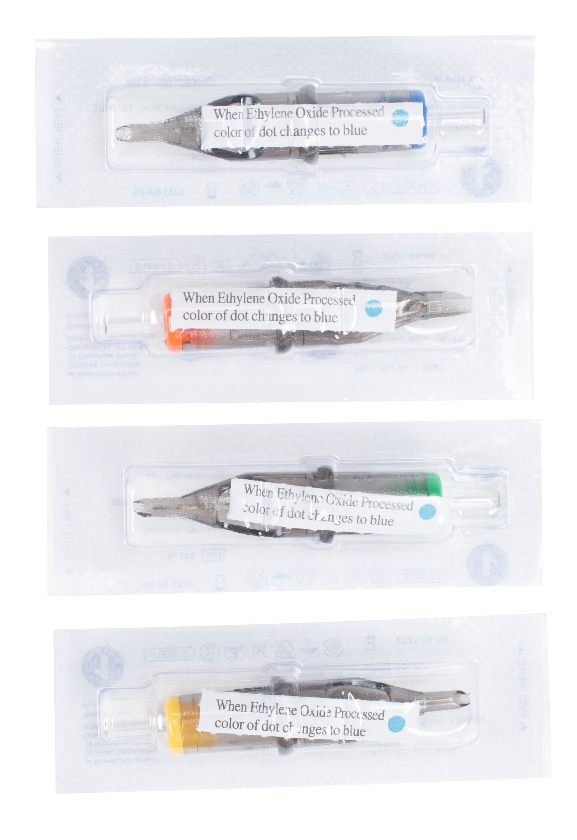 - Each needle cartridge is sterilized and individually wrapped in blister packs with an EO gas proof strip indicator